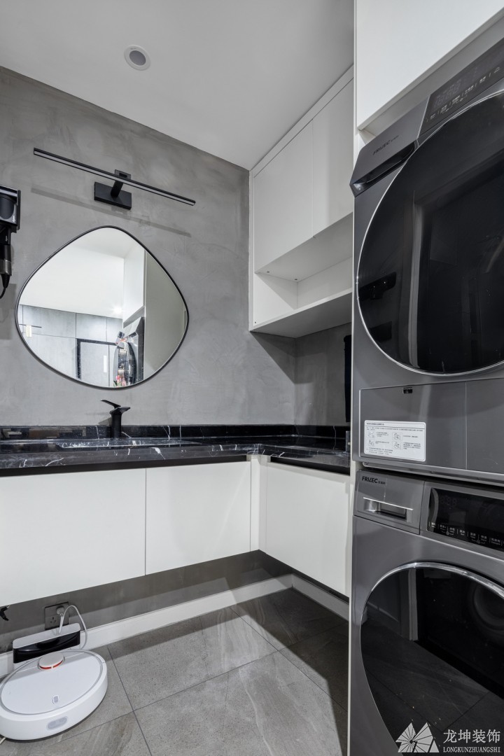 有衛(wèi)生間狹小逼仄,向客廳借用部分空間后,打造為四分離衛(wèi)生間,洗手區(qū)增加烘洗衣機(jī),同時也是小型洗衣房。