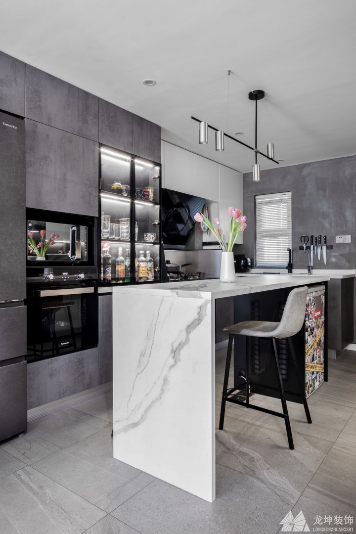 廚房一側(cè)安裝整墻定制柜,封閉柜門+黑波柜門組合設(shè)計,增加空間層次感。柜體專為各式廚房家電留出空間,洗碗機(jī)、烤箱、蒸箱一應(yīng)俱全,讓愛美食的主人盡享烹飪的樂趣。