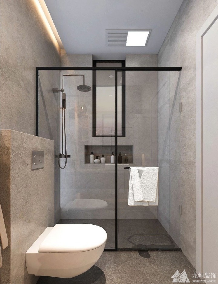 在整體干濕分離的基礎上在淋浴區(qū)做了一個壁龕的設計,這樣可以吧東西放到壁龕中,整體更加美觀。