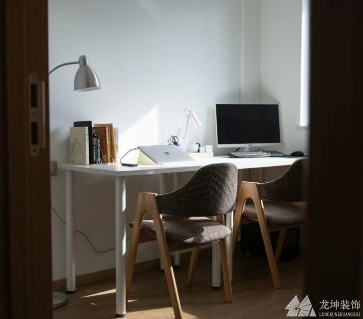 書房作為辦公學(xué)習(xí)的地方我們放置了一個白色長桌方便兩人辦公,另一面放置書架,午后的陽光從百葉窗照射進來悠閑愜意。