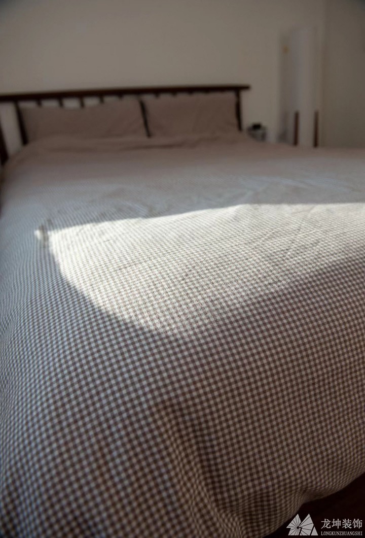 臥室更偏日式?jīng)]有過的修飾,胡桃木床搭配棕色床品,編制布面的窗簾,搭配飄窗更加舒適。